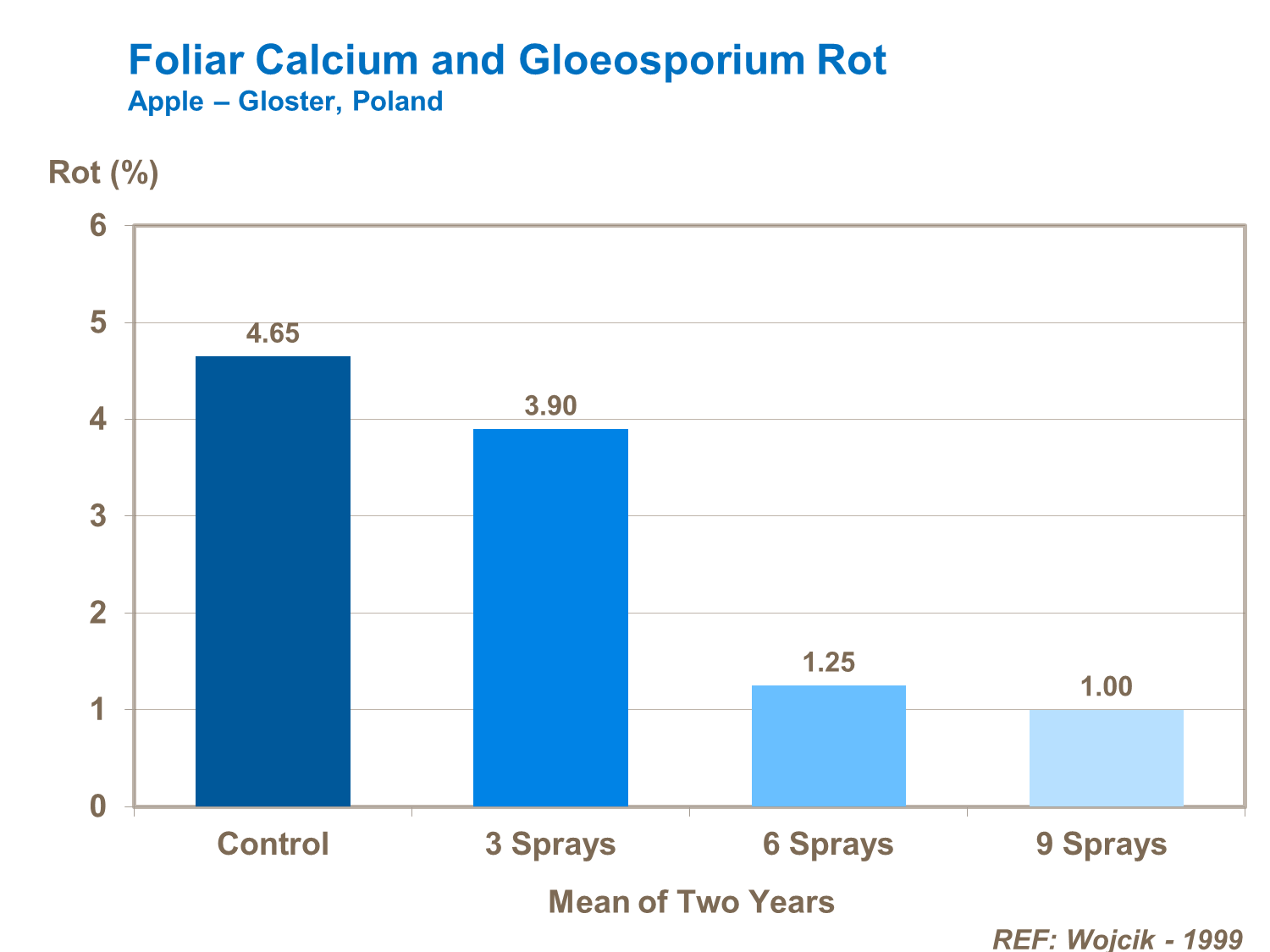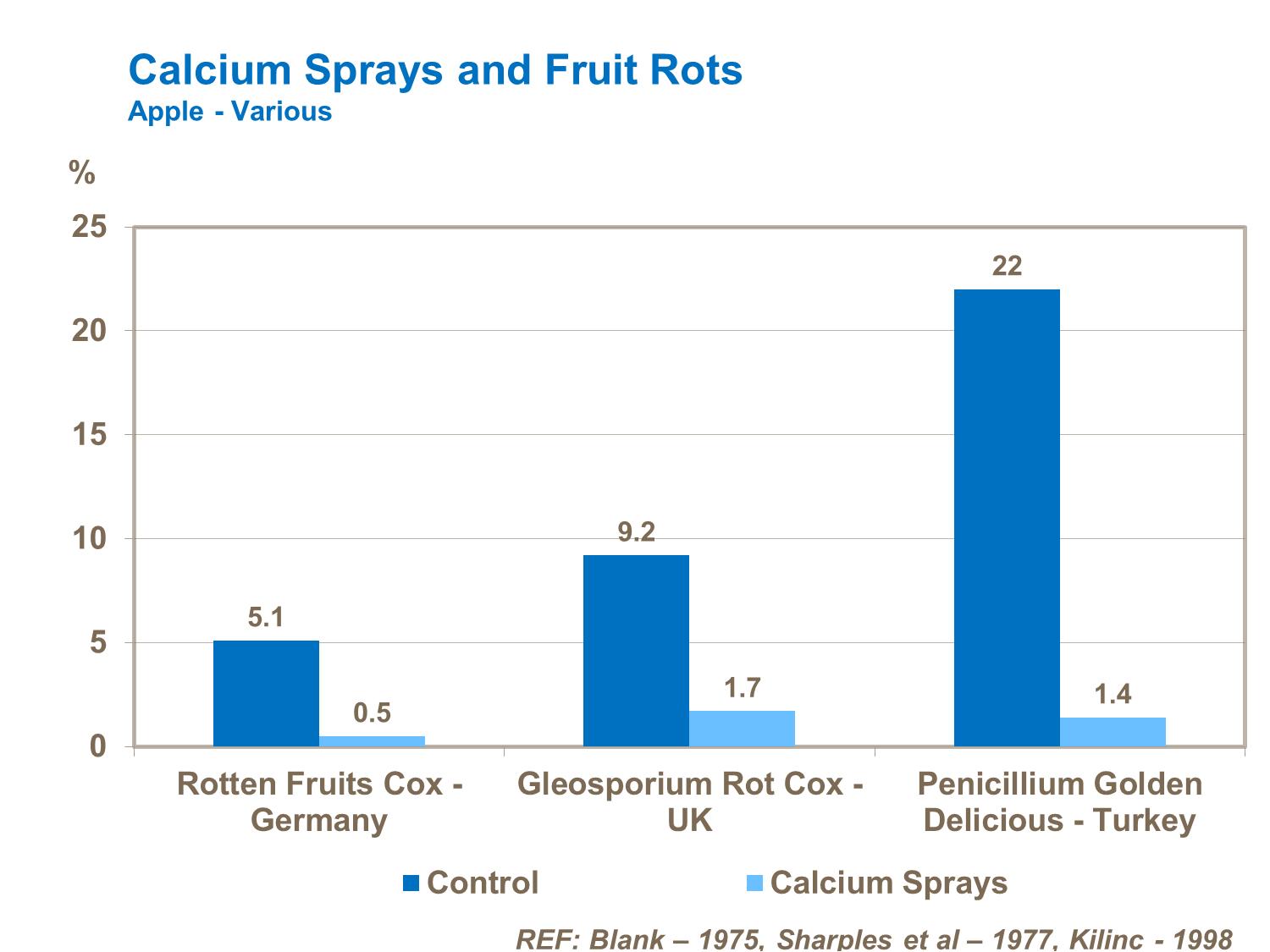 Storage rots including Gloeosporium rot and penicillium can be minimized by use of calcium. Repeated foliar applications are the most effective at alleviating this kind of damage.