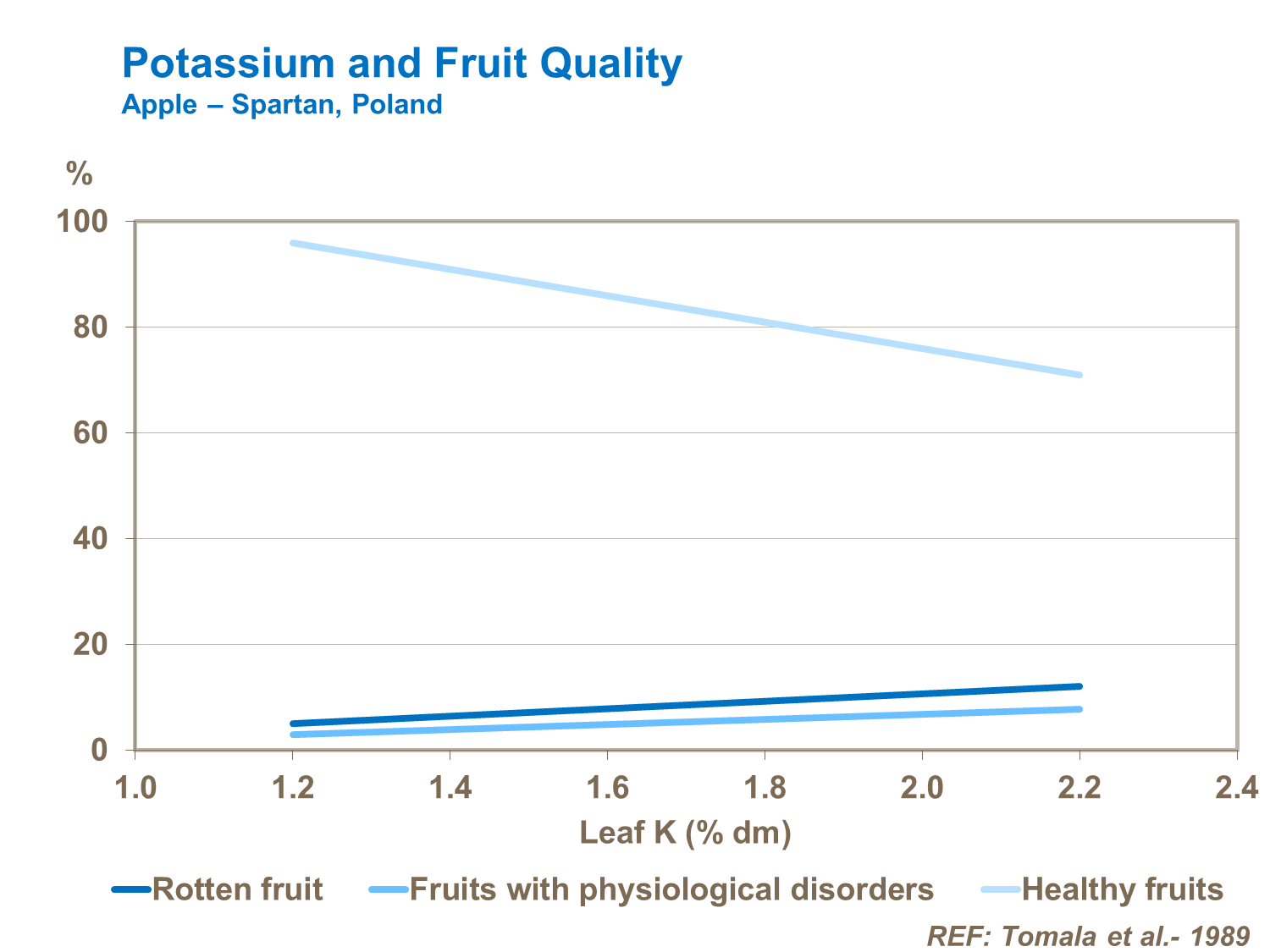 It is important that potassium concentrations are in balance with other cations, particularly calcium, as preferential uptake of potassium over calcium will significantly increase the risk of rotten fruit and physiological disorders.