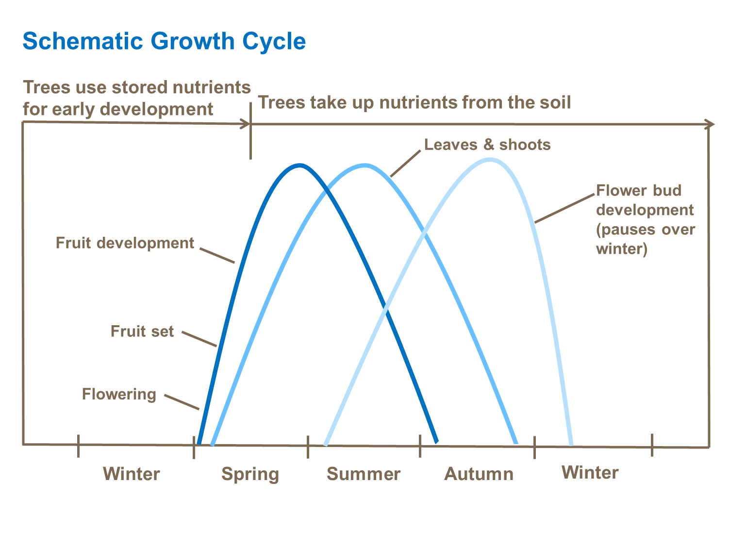 A significant proportion of nitrogen is used early season to provide good vegetative leaf growth, bloom and fruit set. Excessive, later applied nitrogen can adversely affect fruit quality. As a result, it is common practice to apply nitrogen at two main stages of growth. Firstly in the autumn after harvest, to boost reserves in the tree, which can then be re-mobilized to support flowering, fruit set and early leaf development in the early spring. The second, in the spring at flowering, to ensure further fruit and leaf development in late spring and summer.