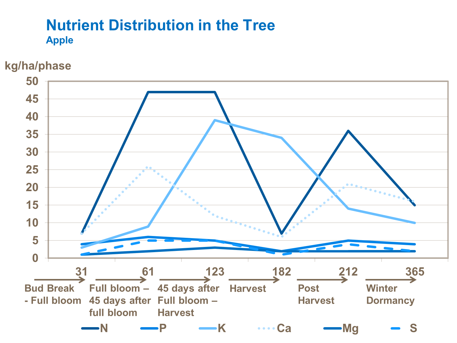 Calcium, potassium and nitrogen are the most important macronutrients needed in productive orchards. Large amounts of calcium are needed within the tree to support healthy growth. While only a small proportion of all calcium ends up in the fruit, this low concentration is critical and it is important in order to minimize storage quality problems.