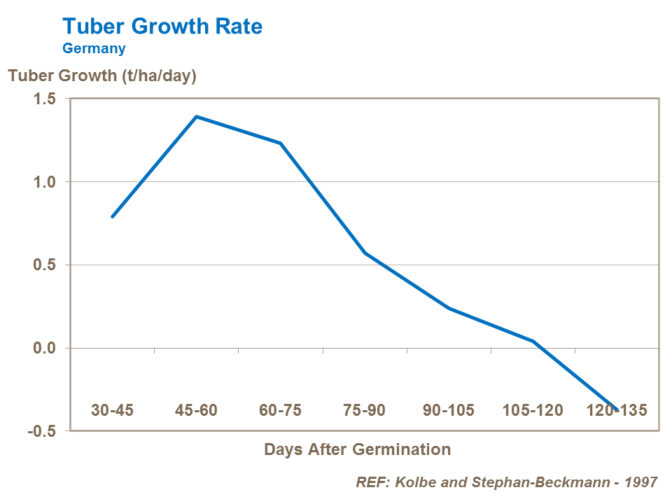Low nitrogen and high sucrose levels in the plant favor the formation of more tubers. Once formed, tubers grow rapidly, reaching a maximum rate of up to 1,400 kg/ha/day in temperate climates. Late varieties seem to be more sensitive to long day lengths or high temperature conditions.