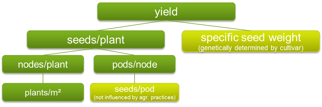 The number of nodes/plant is also influenced by the plant density (plants/m²), the number of seeds/pod can hardly be influenced by agricultural practices.