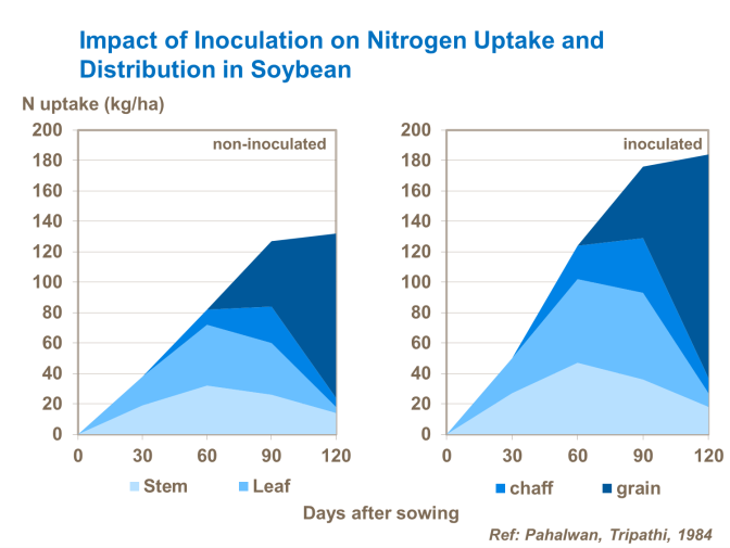 The bacteria use the plant photoassimilates, while the soybean uses the N fixed by bacteria for proteins synthesis. The bacteria fixes the N2 and converts it to NH4+ which is then used by the plant, which releases the photoassimilates.