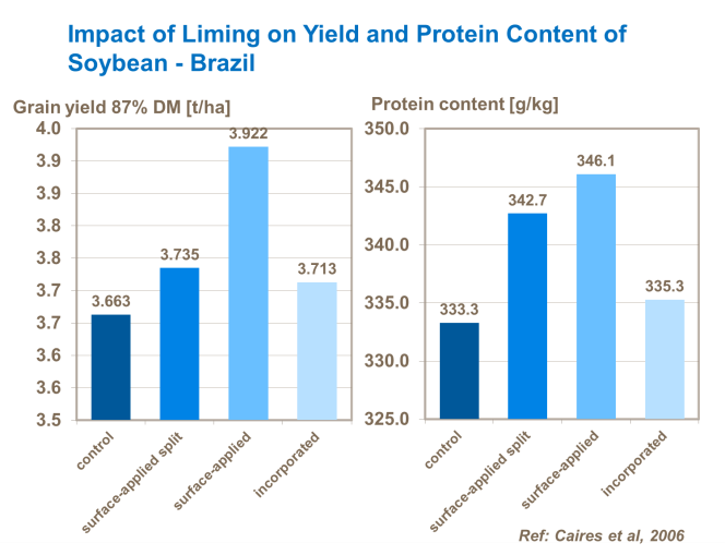 In Brazil, increases of soybeans yield in limed soils has been observed as a result of the pH increases, reduction of Al and Mn toxicity, increased absorption of N, P, K and S, and the supply of Ca and Mg.