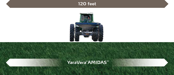A properly calibrated, high-clearance spinner spreader (or European style spreader) can evenly spread YaraVera AMIDAS up to 120’ across the field. Often you can drive in the same tracks as the sprayer to avoid additional tramping and still get the required nitrogen and sulphur applied to the wheat.